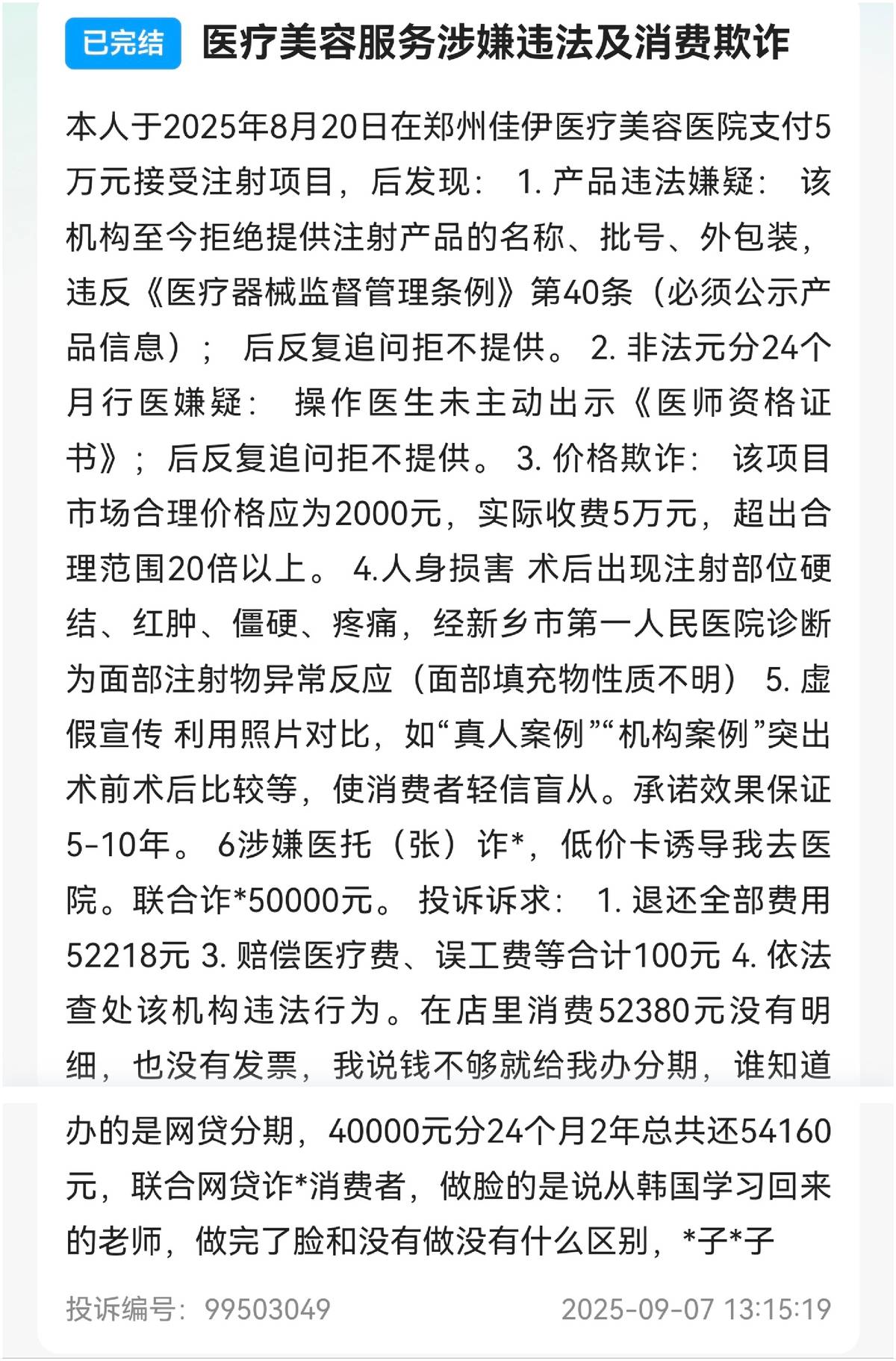 8月20日,一位消费者投诉称其在郑州佳伊医疗美容医院支付5万元接受注射项目后发现该机构存在产品违法嫌疑。该机构拒绝提供注射产品的名称、批号、外包装。该消费者认为该机构违反《医疗器械监督管理条例》第40条(必须公示产品信息),且后反复追问仍拒不提供。
